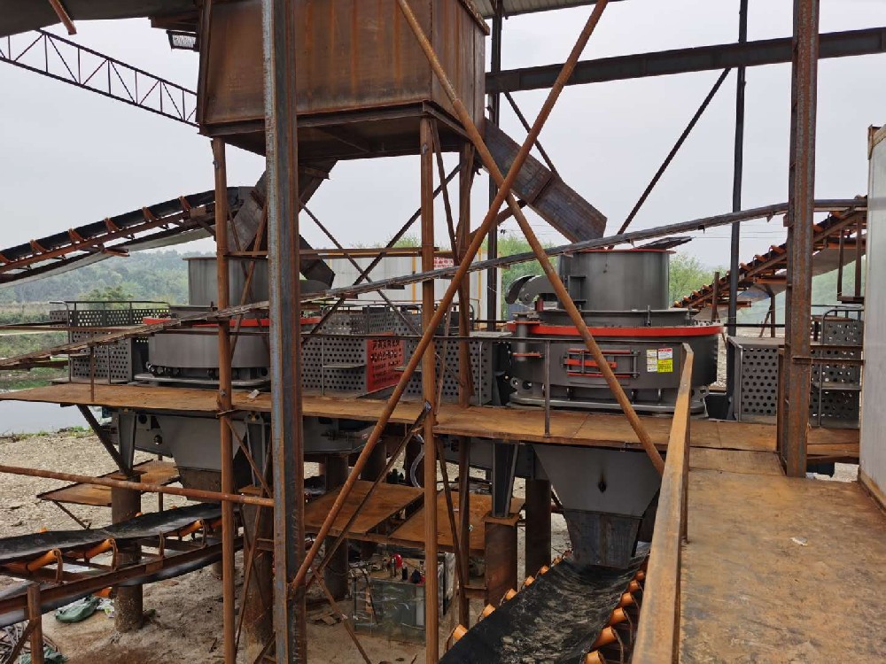 When entering into impeller, the raw material can be crushed directly by hitting impact plate after it is accelerated and threw out. The raw material can also be divided into two parts by material-dividing plate. One falls down from all around. The other enters into impeller and is accelerated, threw out and collides with the falling material and hit, rebound with impact plate. The circulation hits repeats. As the crushing is moving forward, small particle materials will gradually form a material bed around the impact plate which can improve the crushing effect and protect the machine. The desired artificial sand comes downwards though outlet finally.